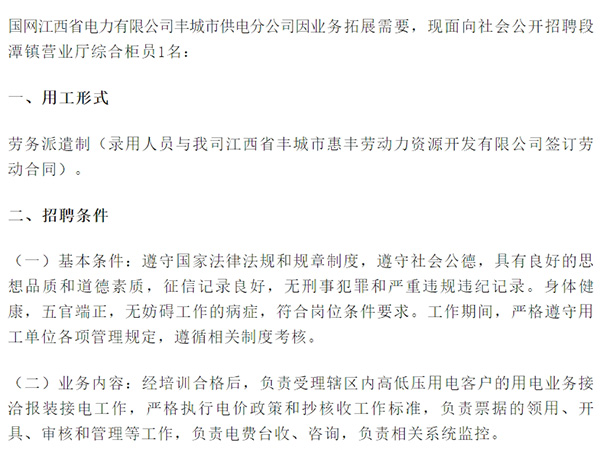 ->查看國網江西省電力有限公司豐城市供電分公司因業(yè)務拓展需要,現面向社會公開招聘段潭鎮營業(yè)廳綜合柜員1名:一、用工形式勞務派遣制(錄用人員與我司江西省豐城市惠豐勞動力資源開發(fā)有限公司簽訂勞動合同)。二、招聘條件(一)基本條件:遵守國家法律法規(guī)和規(guī)章制度,遵守社會公德,...